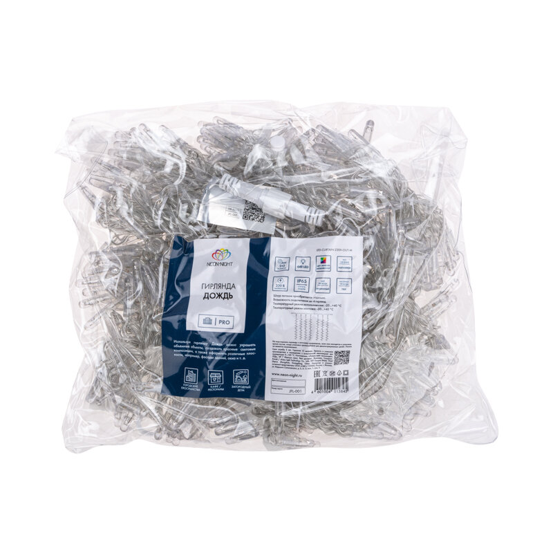 Светодиодная гирлянда NEON-NIGHT "Дождь" 2.5х2 м, 8 режимов, 300 белых светодиодов, прозрачный провод