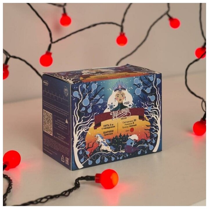 Гирлянда "Нить" 5 м с насадками "Шарики красные", IP20, тёмная нить, 30 LED, свечение красное, 8 режимов, 220 В