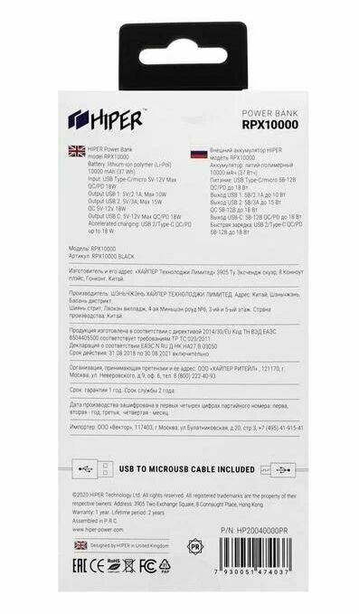 Внешний аккумулятор (Power Bank) HIPER RPX10000, 10000мAч, черный [rpx10000 black]