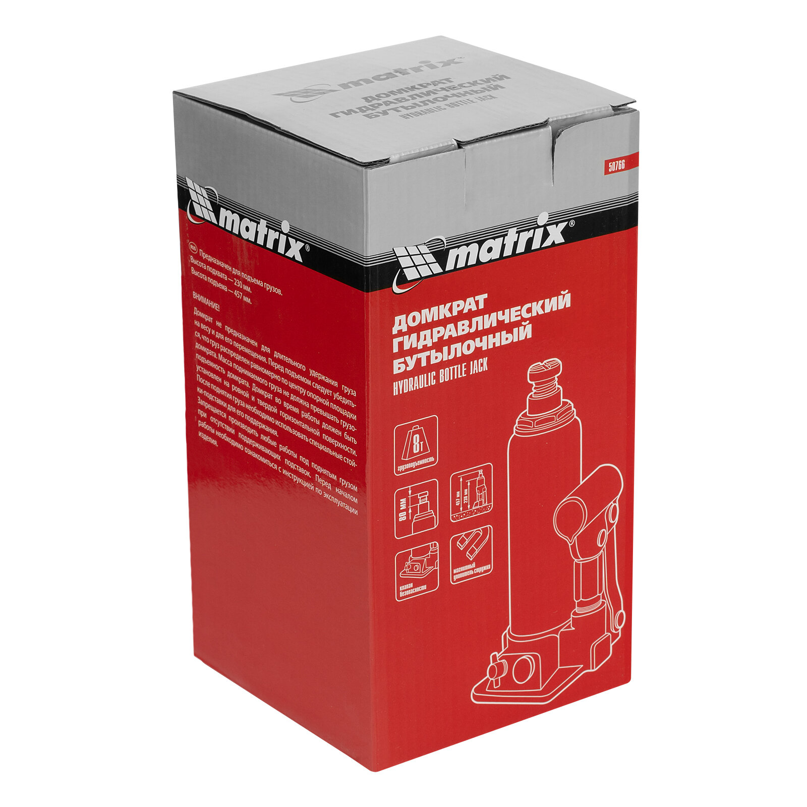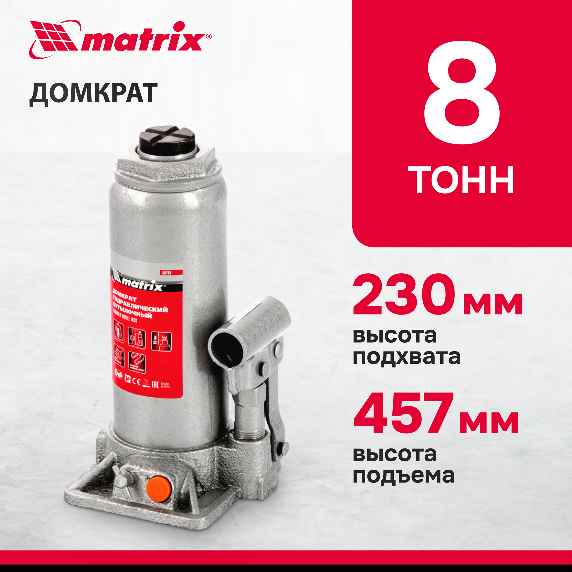 Домкрат гидравлический бутылочный Matrix 50766, 8 т, h подъема 230–457 мм