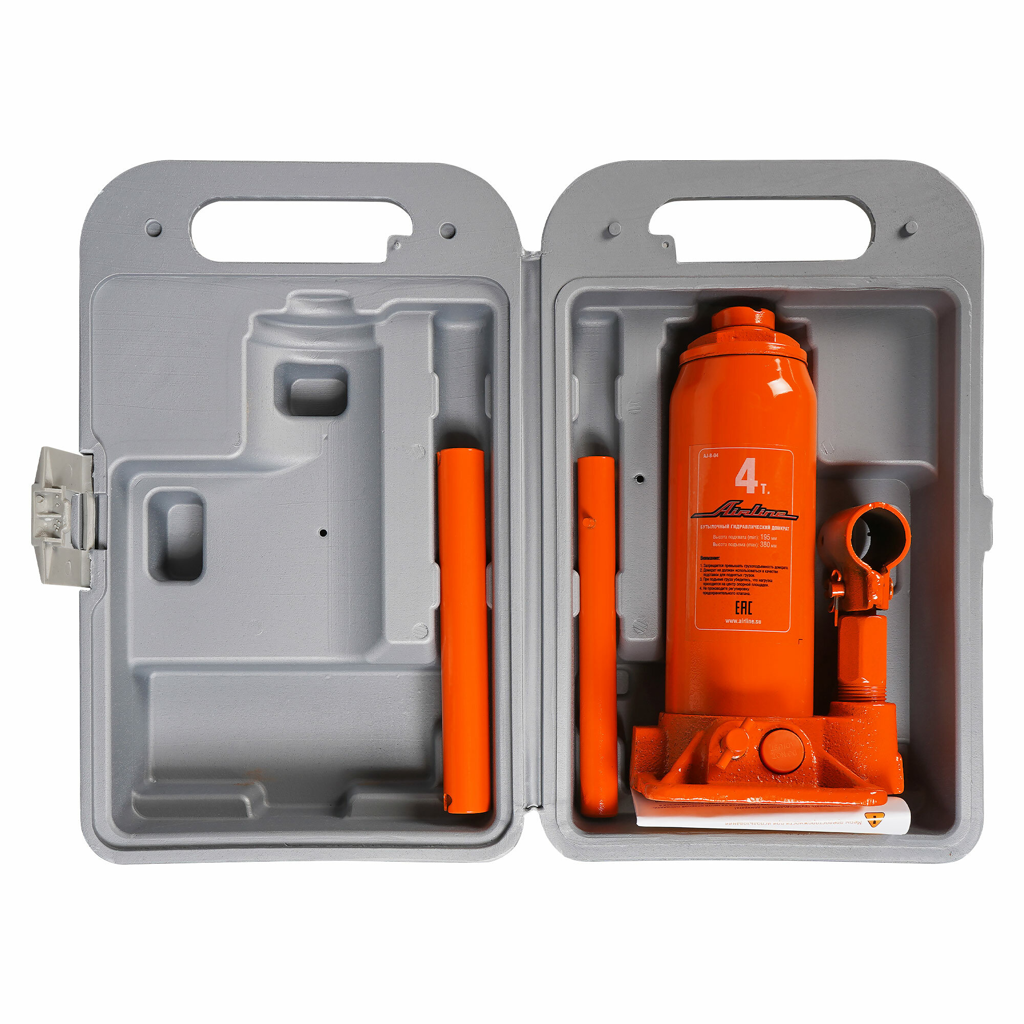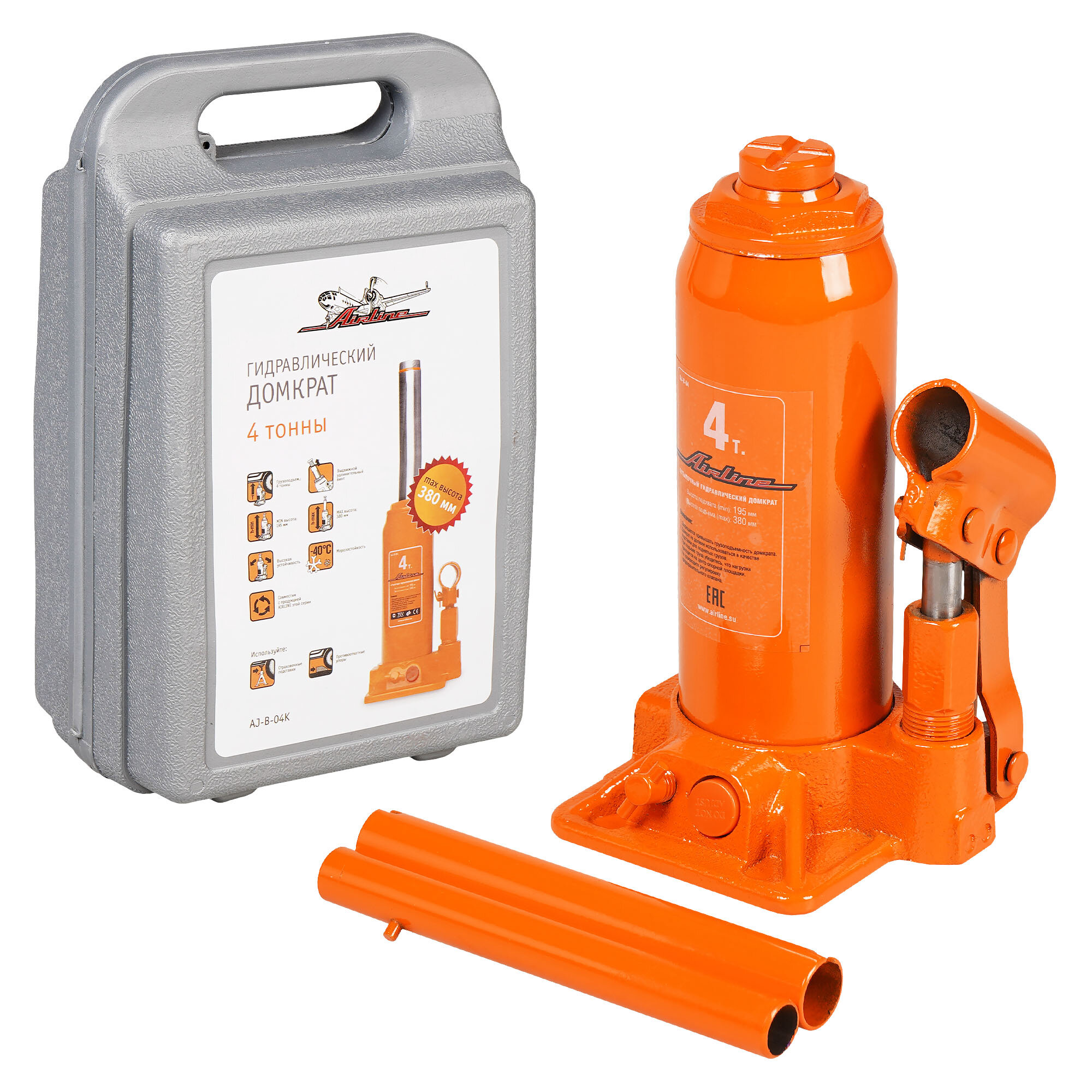 Airline AJ-B-04K (410410 / AJB04K) домкрат бутылочный 4т в кейсе (min - 195 мм, max - 380 мм) (aj-b-04k)