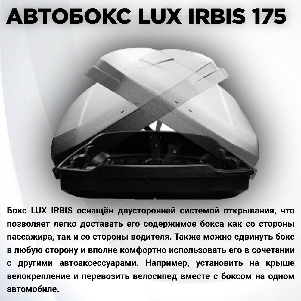 Бокс на крышу LUX IRBIS 175, 450л, серый матовый, 175х85х40, с двухсторонним открыванием, арт:LUX-790951