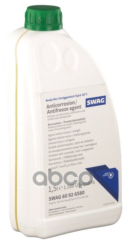 SWAG 60 92 6580 Готовый антифриз до -30C (зелёный 1.5л) G11 Renault Typ D, Glaceol RX type D