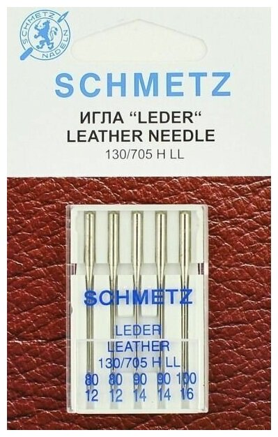 Швейные иглы для кожи № 80 (2), 90 (2), 100 (1), 5 штук, Schmetz 130/705Н LL для швейных машин