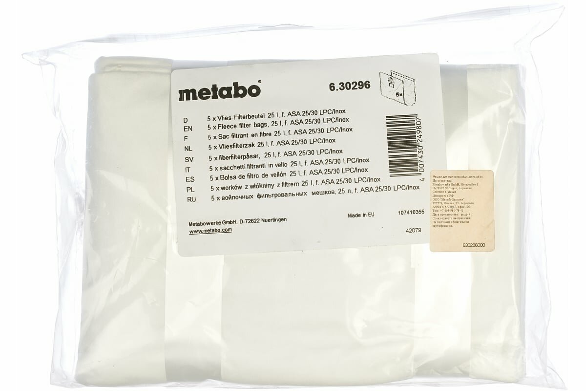 Мешок для пылесоса флис 25/30; ASA25/30 L PC (уп.5шт) Metabo 630296000 ( 1упак. )