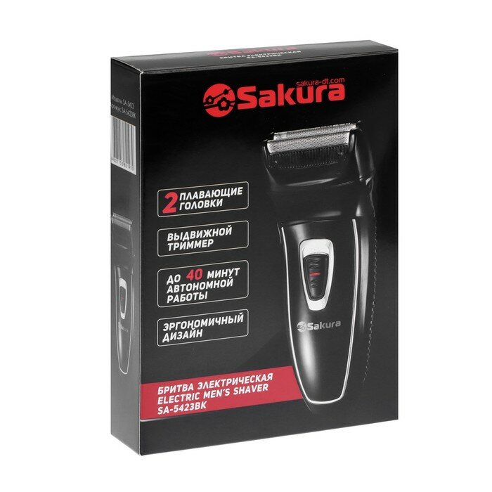Купить SAKURA Электробритва Sakura SA-5423BK, роторная, 2 головки, сухое бритьё, триммер, АКБ, чёрная