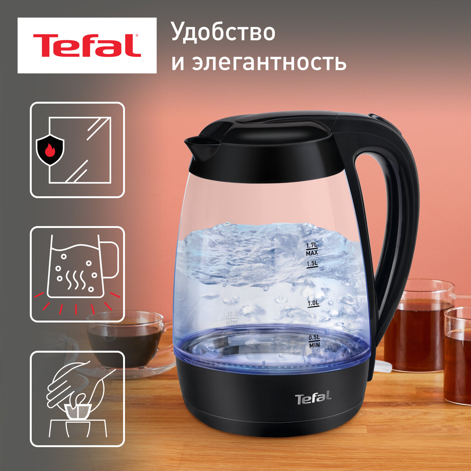Tefal Чайник электрический TEFAL KO450832, стекло, 1.7 л, 2400 Вт, чёрный