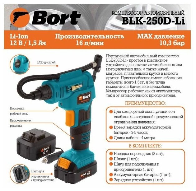 Компрессор автомобильный BLK-250D-Li, 93410884, 12В., 7А, 1.5Ач., BORT интересное: