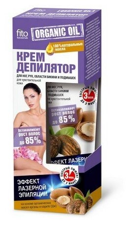 FITO косметик, ORGANIC OIL, Крем-депилятордля ног, рук, области бикини и подмышек, для чувствительной кожи, Эффект лазерной эпиляции, туба, 100 мл