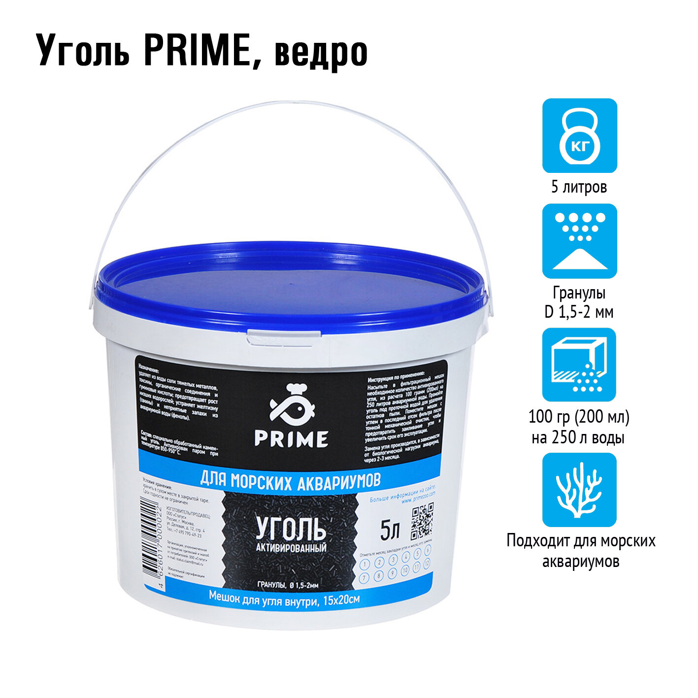 Prime уголь для морских аквариумов, гранулы D 1,5-2 мм, 5 л