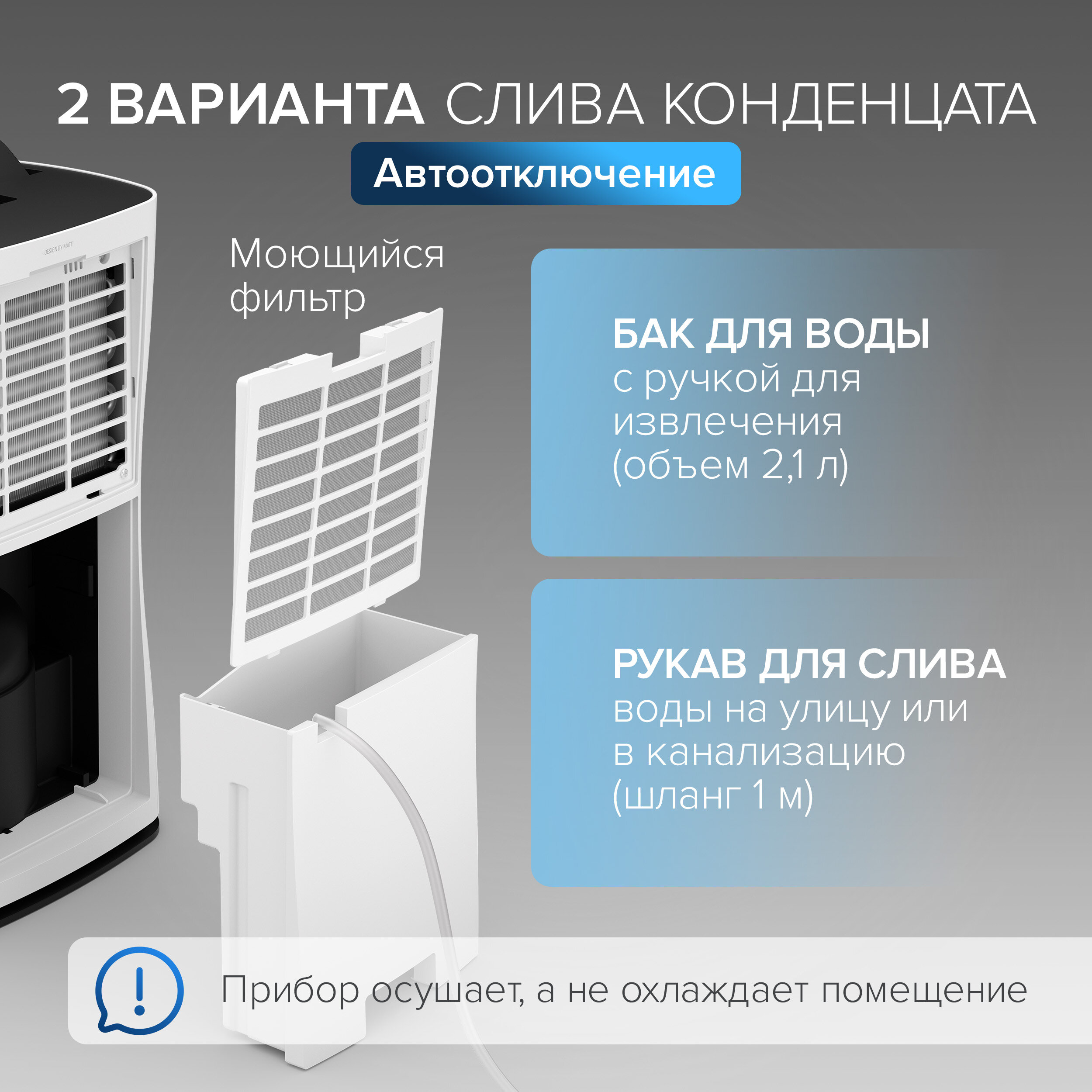 | Плюсы: | Дизайнерски современен, не громкий, осушает в авторежиме - то что надо. Есть шланг для слива воды, не надо бочёк постоянно выносить ( хотя и бочёк есть, для пешеходов). По сути управляется одной кнопкой - это удобно. Воздух не охолождает - это плюс.