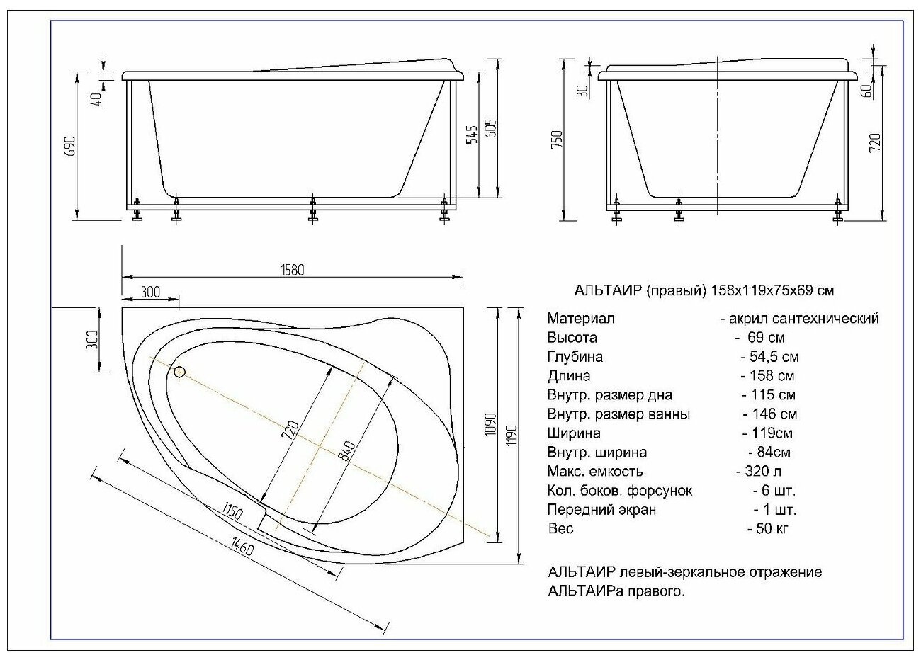 Акриловая ванна Aquatek Альтаир 158x119 R ALT160-0000047 без гидромассажа с фронтальной панелью с каркасом (вклеенный) со слив-переливом