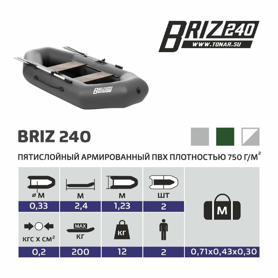 Лодка Тонар ПВХ Бриз 240 зеленый (2 мест., р-р 240*123 см.) с веслами, с сиденьями, до 200 кг