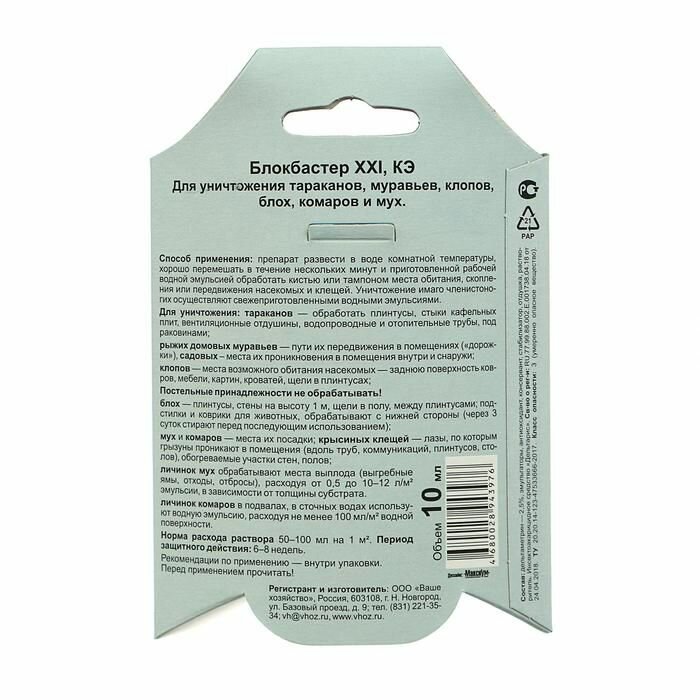 Блокбастер 10мл. От тараканов/муравьев/клопов/блох/комаров/мух, дельтаметрин Ваше хозяйство (арт. 762190)