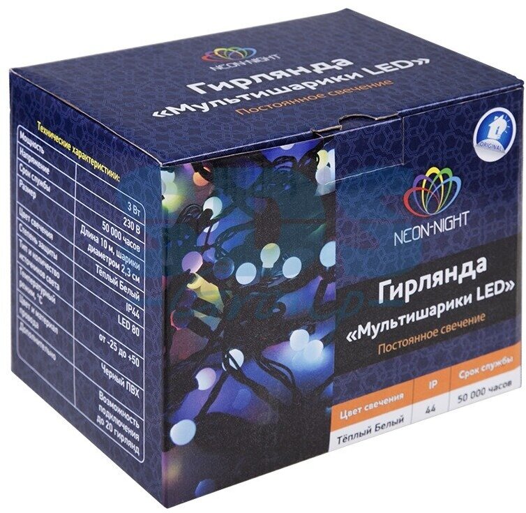 Гирлянда украшение новогоднее светодиодная Мультишарики Neon-night диаметр 23 мм, длина 10 м, черный ПВХ, 80 LED диодов, цвет свечения теплый белый