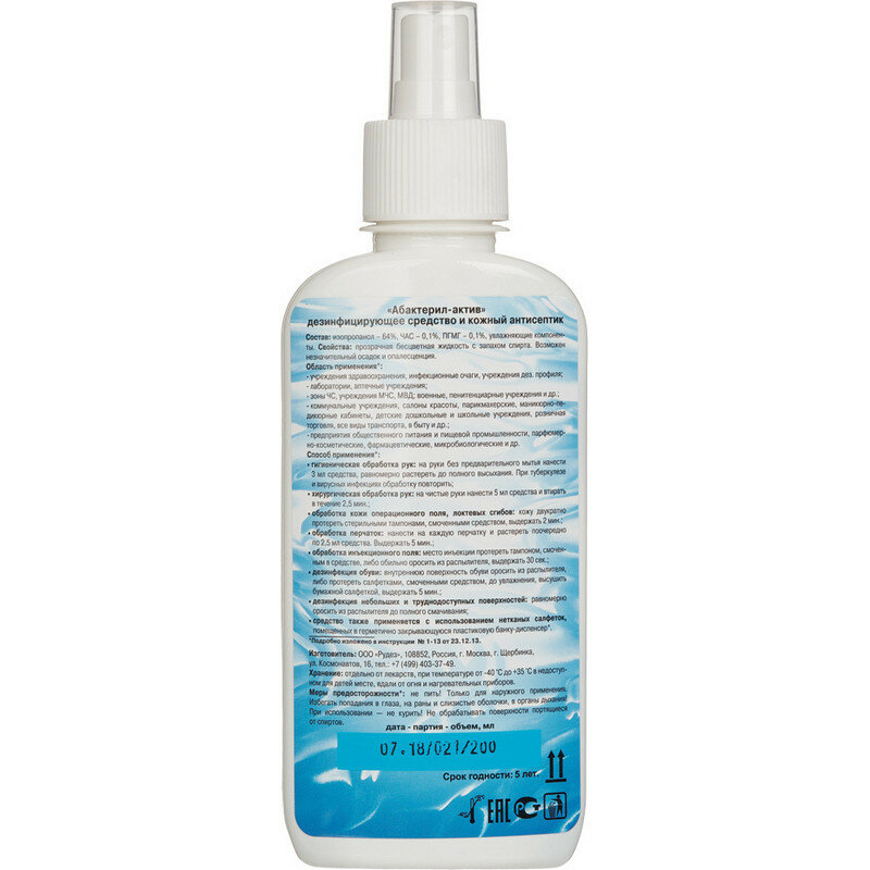 Купить Кожный антисептик с вирулицидной активностью ГОСТ 12.1.007-76 Абактерил-Актив, 200 мл. спрей