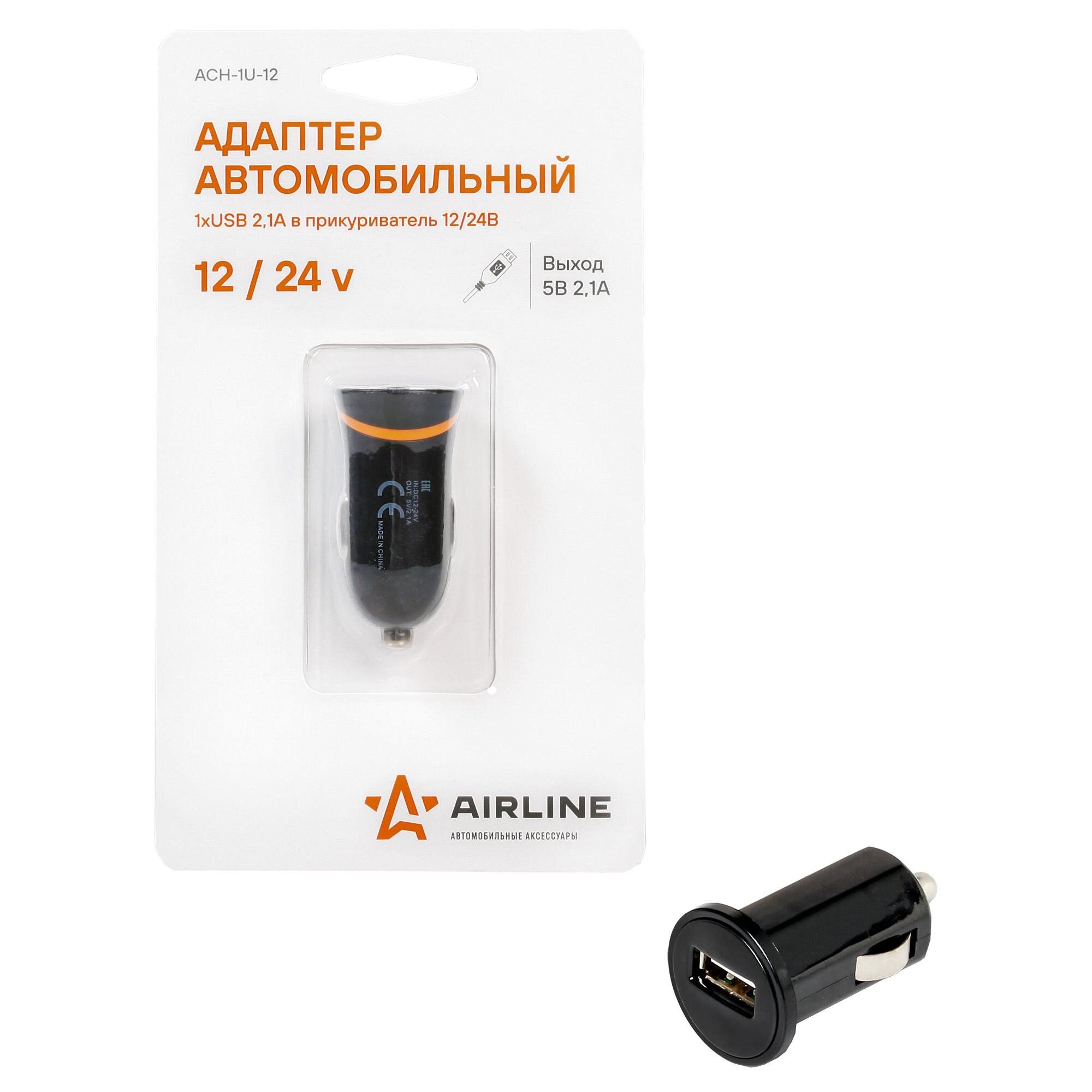 AIRLINE ACH-1U-12 Адаптер автомобильный 1хUSB 2.1А в прикуриватель 12/24В
