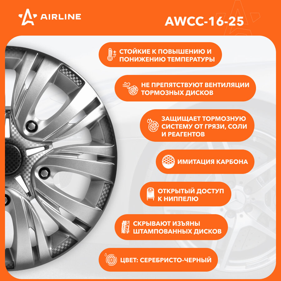 Колпаки Колесные Airline 16" "Лион +" Серебристо-Черный, Карбон, Компл. 2Шт. AIRLINE арт. AWCC-16-25