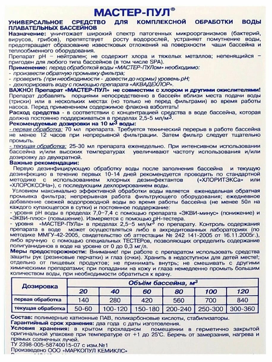 Бесхлорное средство для обеззараживания и очистки воды маркопул кемиклс мастер-пул
