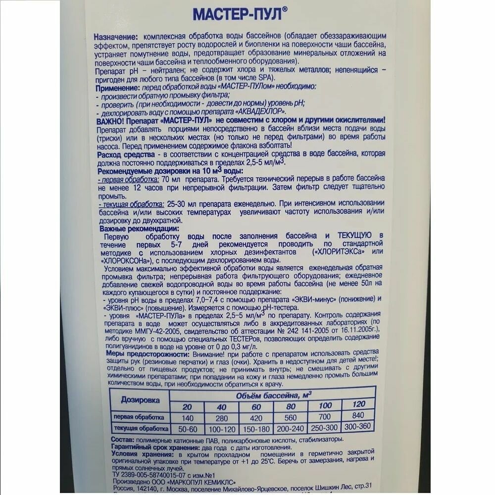 Мастер-пул (1л): Бесхлорное средство для очистки воды в бассейне 4 в 1. Маркопул Кемиклс