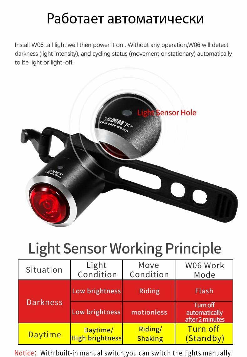 Обладает встроенным датчиком освещенности, включается автоматически с наступлением сумерек. Выключается также автоматически, через две минуты после остановки, или нахождения в состоянии покоя. Заряжается через порт USB. Качественный алюминиевый корпус, удобное универсальное крепление. |