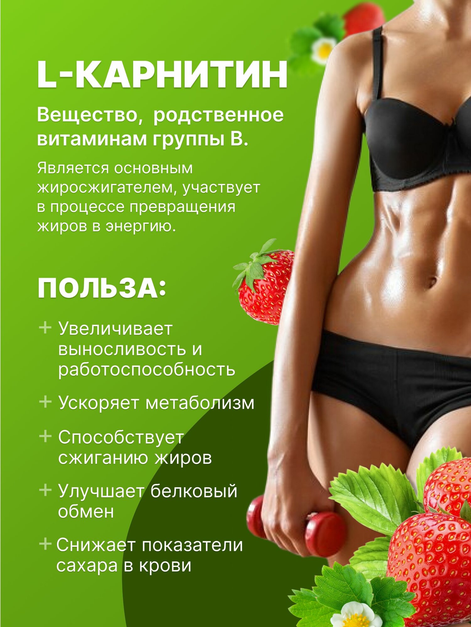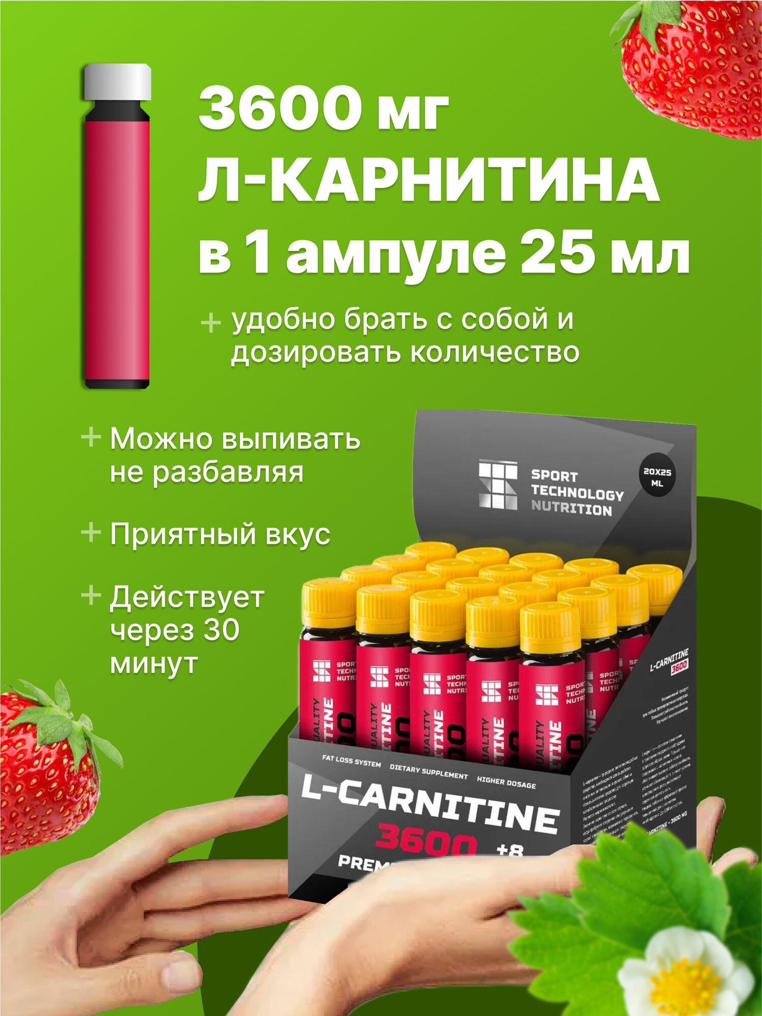 L-карнитин 3600 мг, 20 ампул по 25 мл, клубника, жиросжигатель для похудения мужчин и женщин, Л карнитин