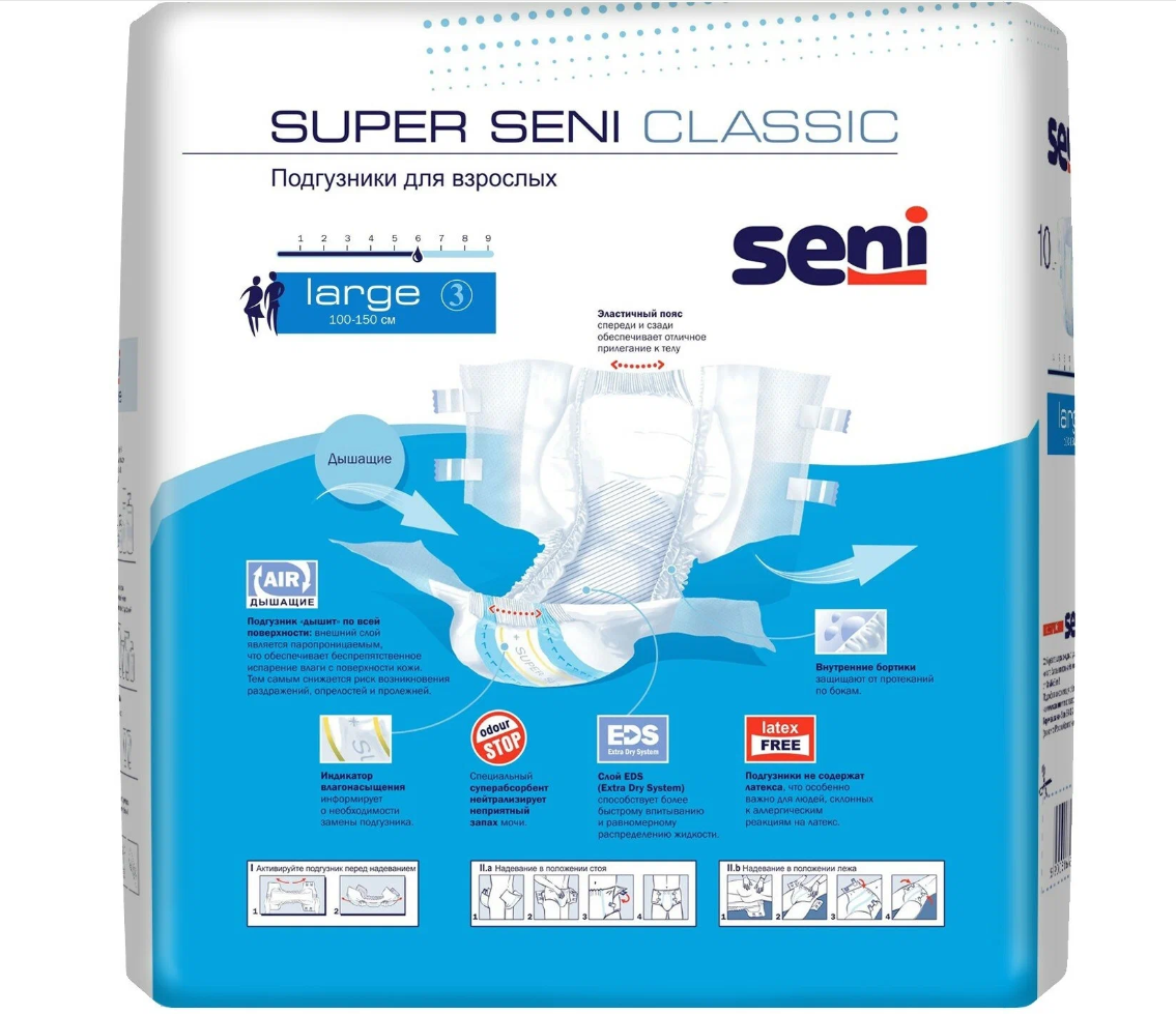 Seni Super Classic, подгузники для взрослых Large (№3), 10 шт
