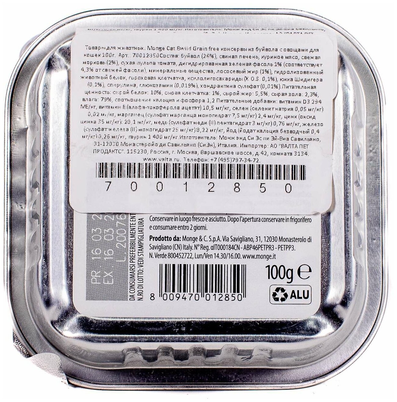 Влажный корм для кошек Monge BWILD Feed the Instinct для крупных пород, беззерновой, с буйволом, с овощами 12 шт. х 100 г (паштет)