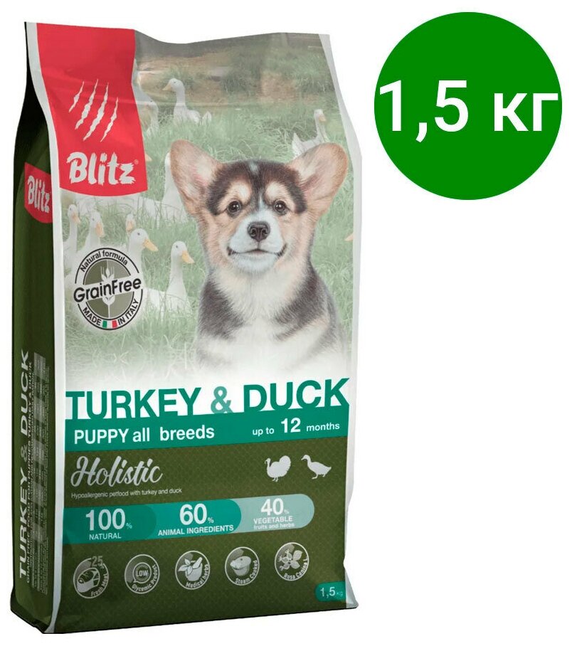 Сухой корм BLITZ HOLISTIC GRAIN FREE PUPPY TURKEY & DUCK беззерновой для щенков всех пород с индейкой и уткой (1,5 кг)
