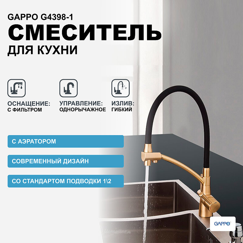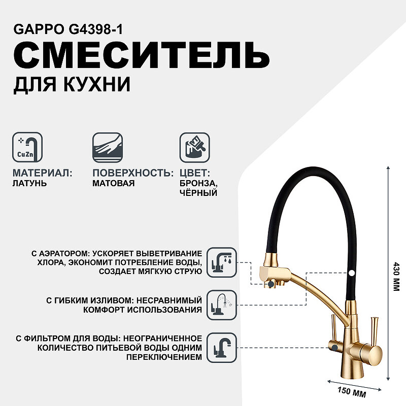 Смеситель для кухни 35к G4398-1 GAPPO гибкий излив, с вых. для питьевого фильтра, черный-бронза
