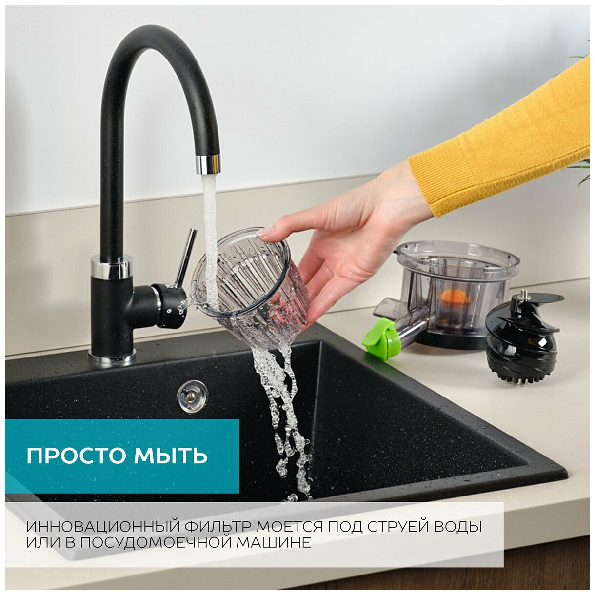 | Отзыв: | Отжим получается холодный, при этом внутренняя поверхность фильтра покрыта титаном и не происходит химических реакций, то есть все полезные свойства сохраняются. Размеры компактные, быстро разбирается, все элементы легко можно помыть в посудомоечной машинке. Носик со специальной крышкой от падения капель сока на столешницу. |