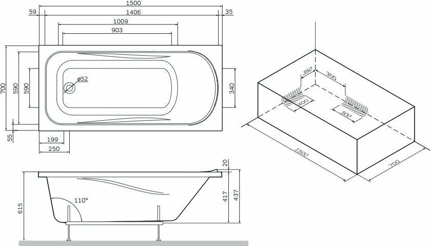 W76A-150-070W-A Sense New, ванна акриловая A0 150x70, см