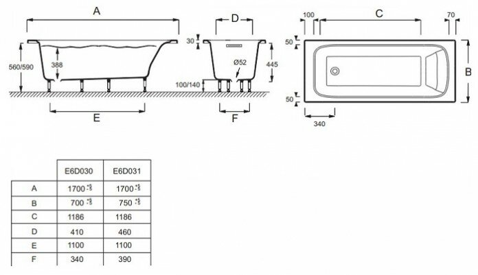 Ванна Jacob Delafon ELITE 170х70см с круглым сливом, комплект регулируемых ножек (E6D030RU-00)