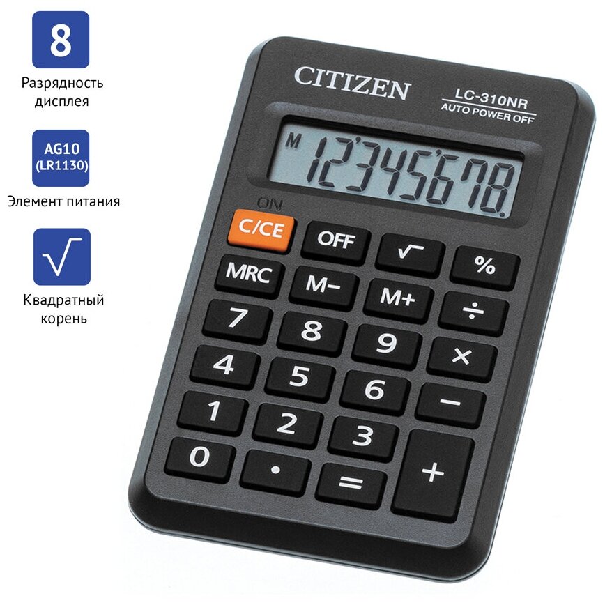 Калькулятор карманный CITIZEN LC310NR (114х69 мм), 8 разрядов, питание от батарейки, LC-310NR (цена за 1 ед.товара)