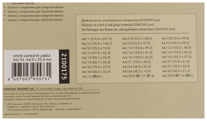 Lomond Этикетка самоклеящаяся LOMOND, на листе формата А4 24 этикетки 64,6х33,4 мм, 50 листов, белая матовая (2100175)