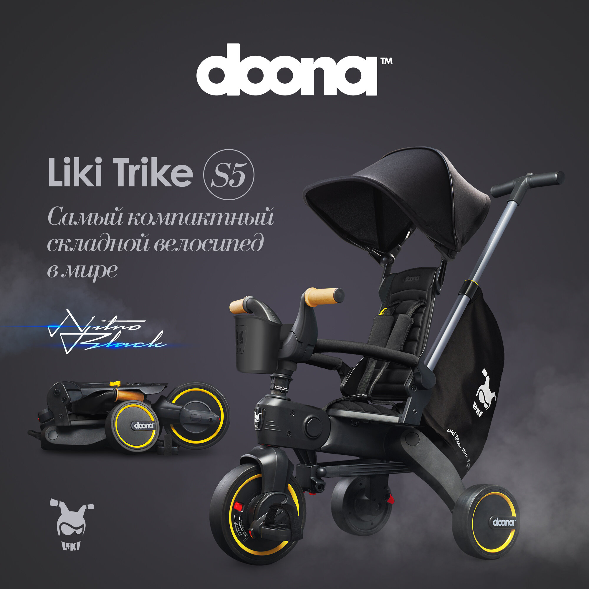 Велосипед детский складной DOONA LIKI Trike S5 с родительской ручкой, трехколесный с 10 мес. Цвет: Nitro Black, черный