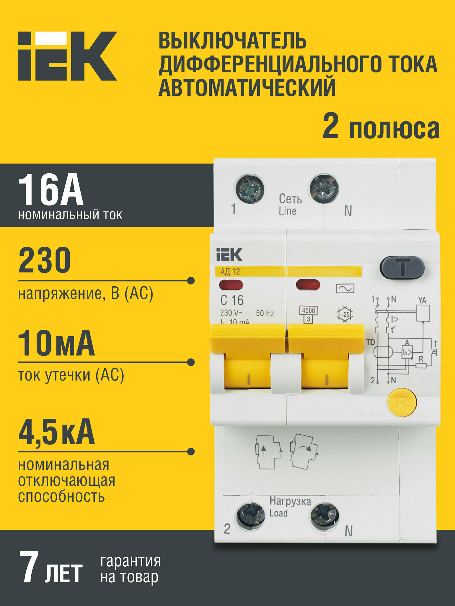 Дифференциальный автоматический выключатель АД12 2Р 16А 10мА IEK