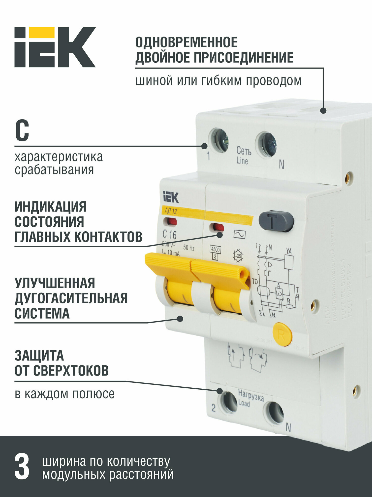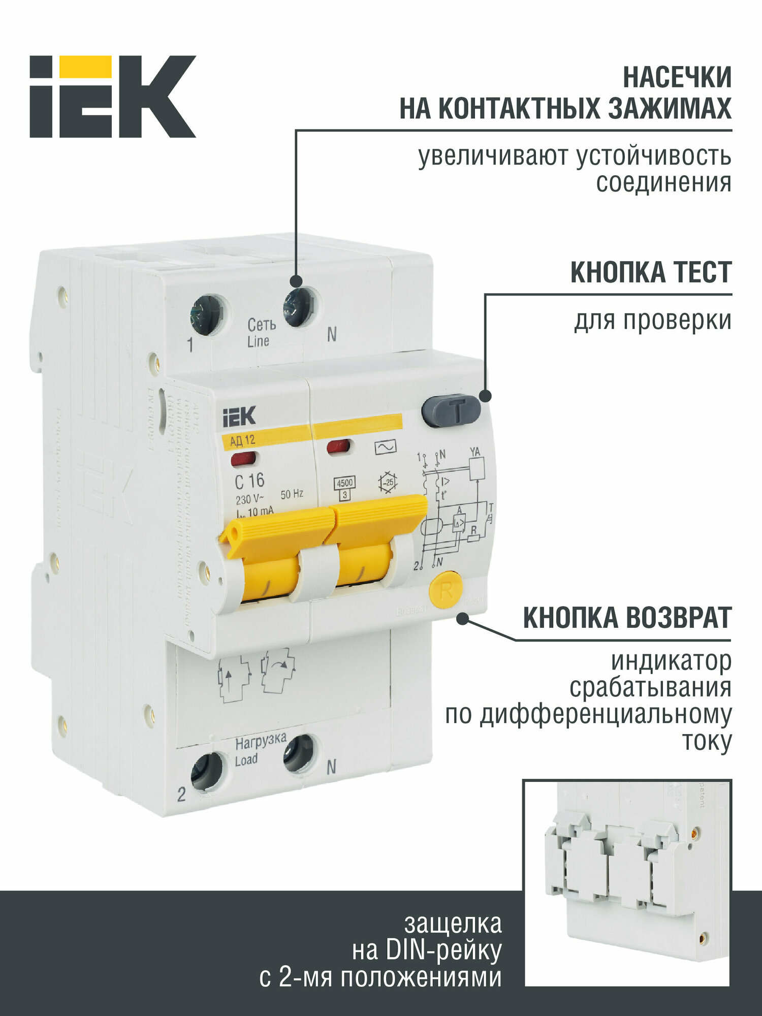 Дифференциальный автомат IEK АД 12 2П 10 мА C 4.5 кА AC 16 А