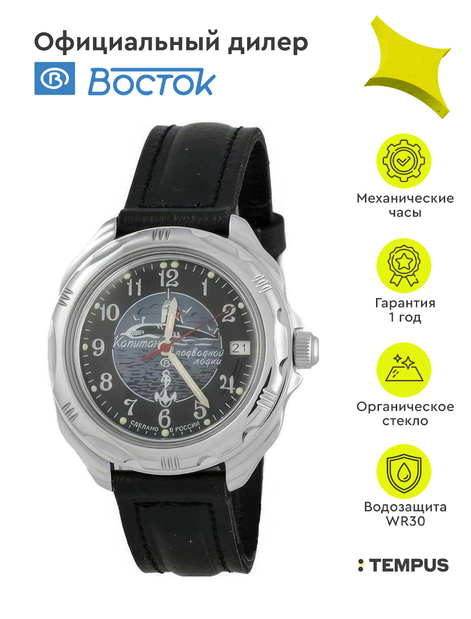 Мужские наручные часы Восток Командирские 211831-classic, натуральная кожа, черный