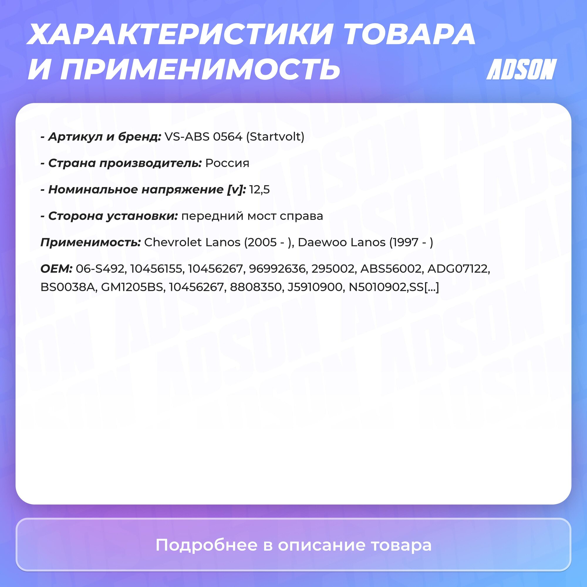 STARTVOLT VS-ABS-0564 Датчик ABS для а/м Chevrolet Lanos (97-) перед. прав. (VS-ABS 0564)