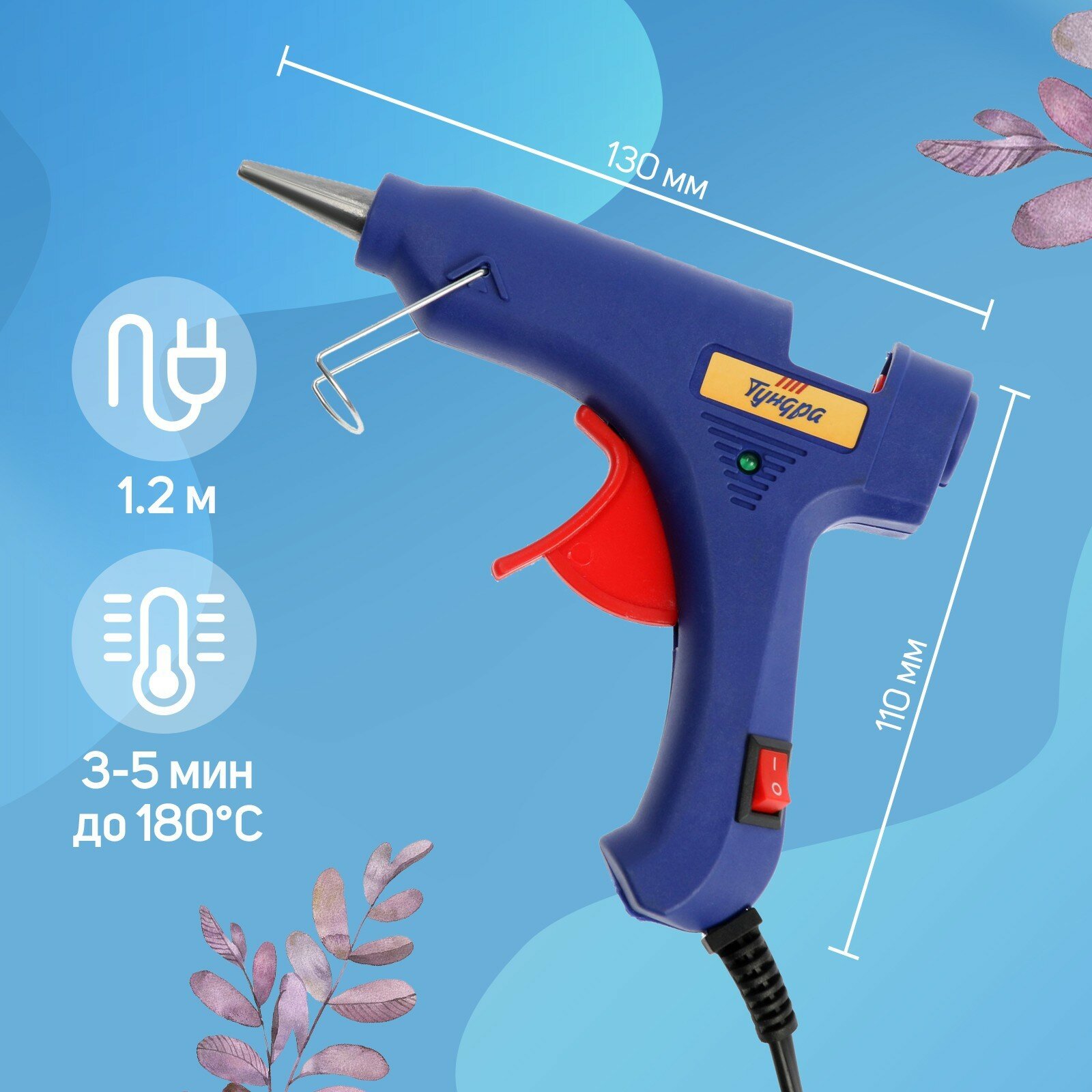 Клеевой пистолет TUNDRA, 20 Вт, 220 В, шнур 1.2 м, выключатель, индикатор, антикапля, 7 мм TUNDRA 43