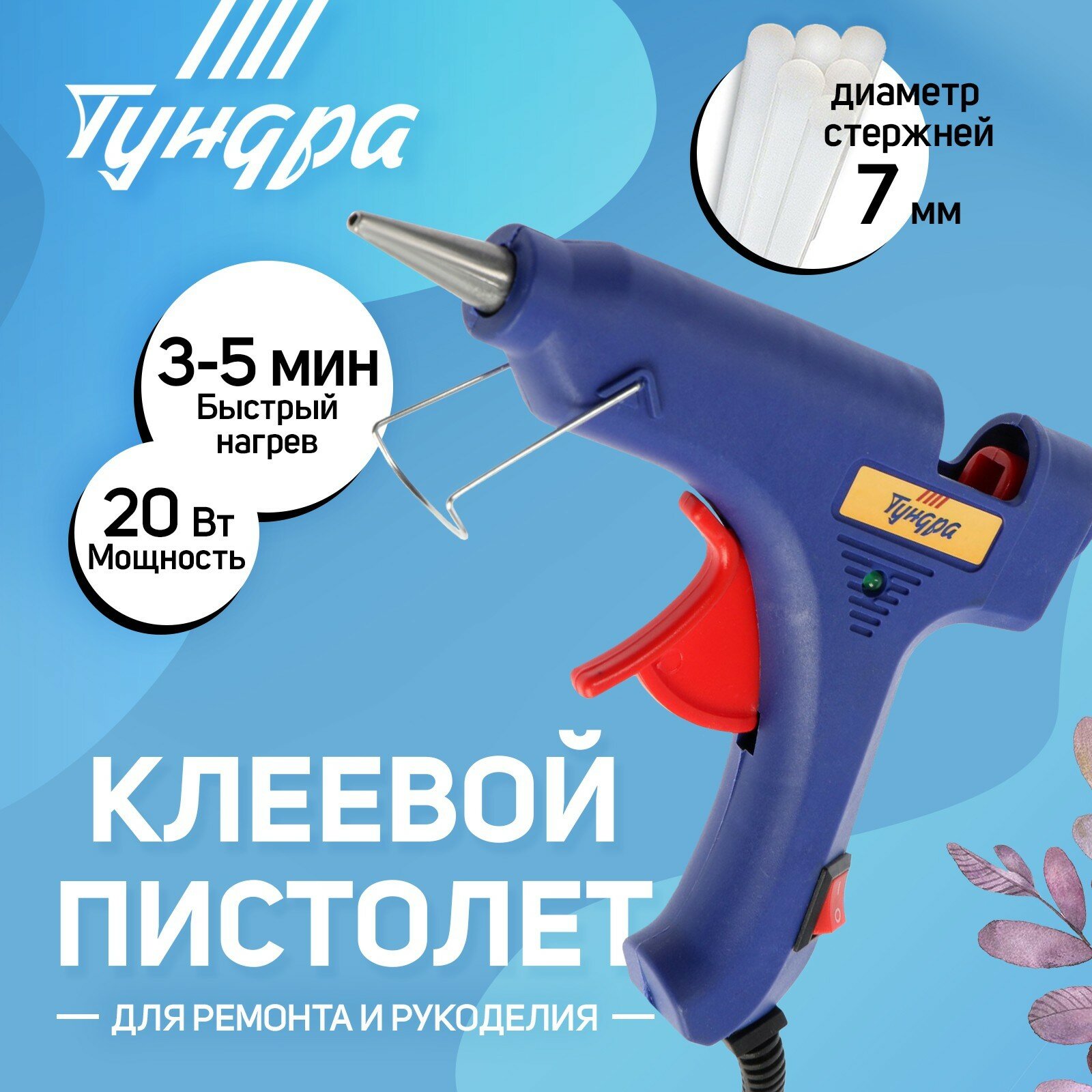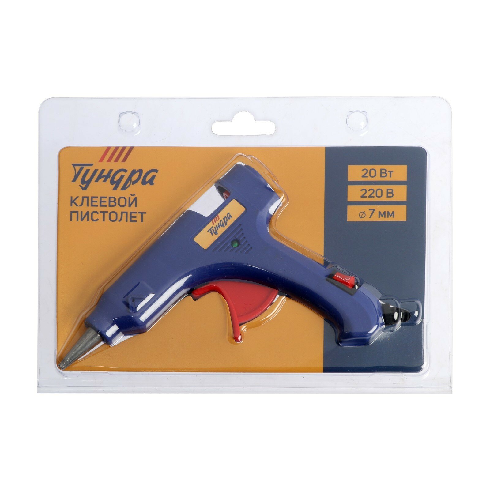 Клеевой пистолет TUNDRA, 20 Вт, 220 В, выключатель, индикатор, антикапля, шнур 1.2 м, 7 мм