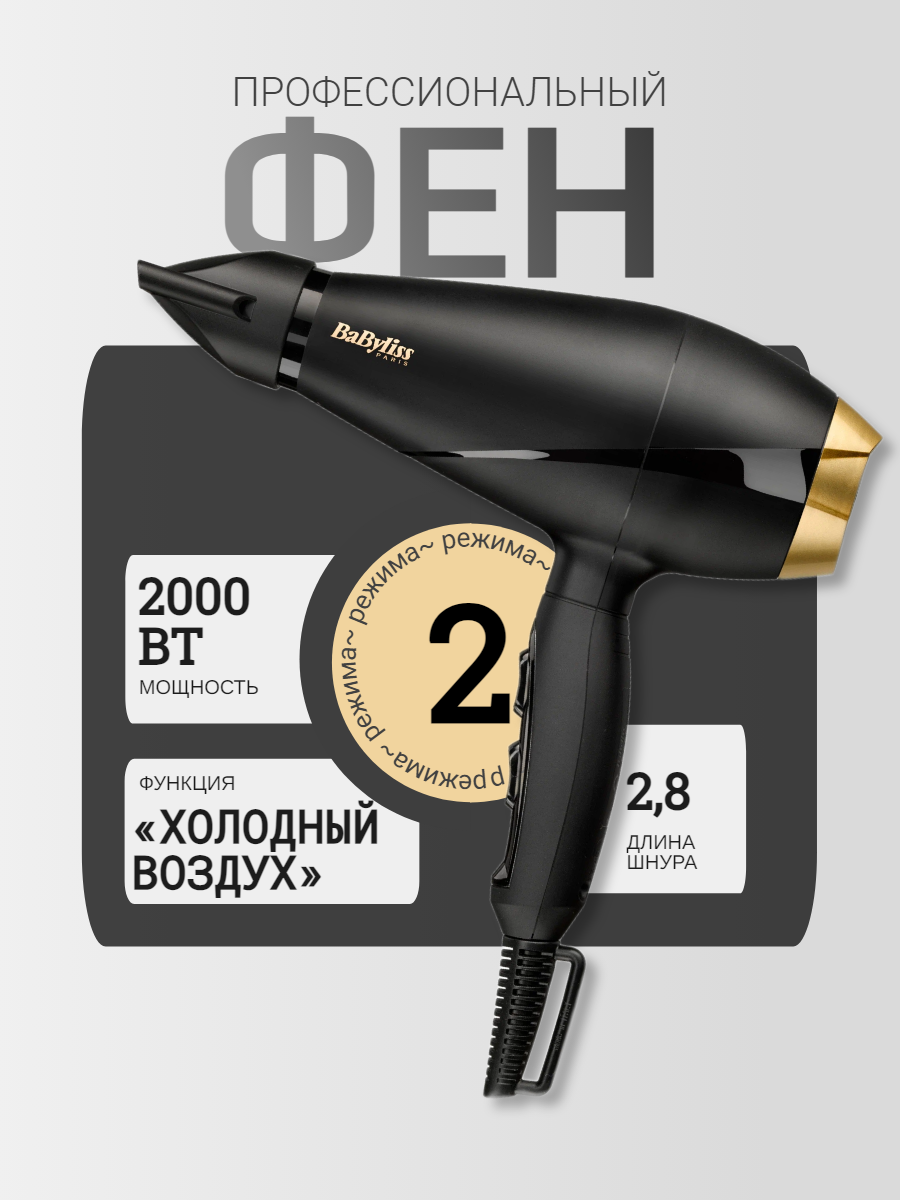 Фен BABYLISS 6704E, 2000Вт, черный и золотистый