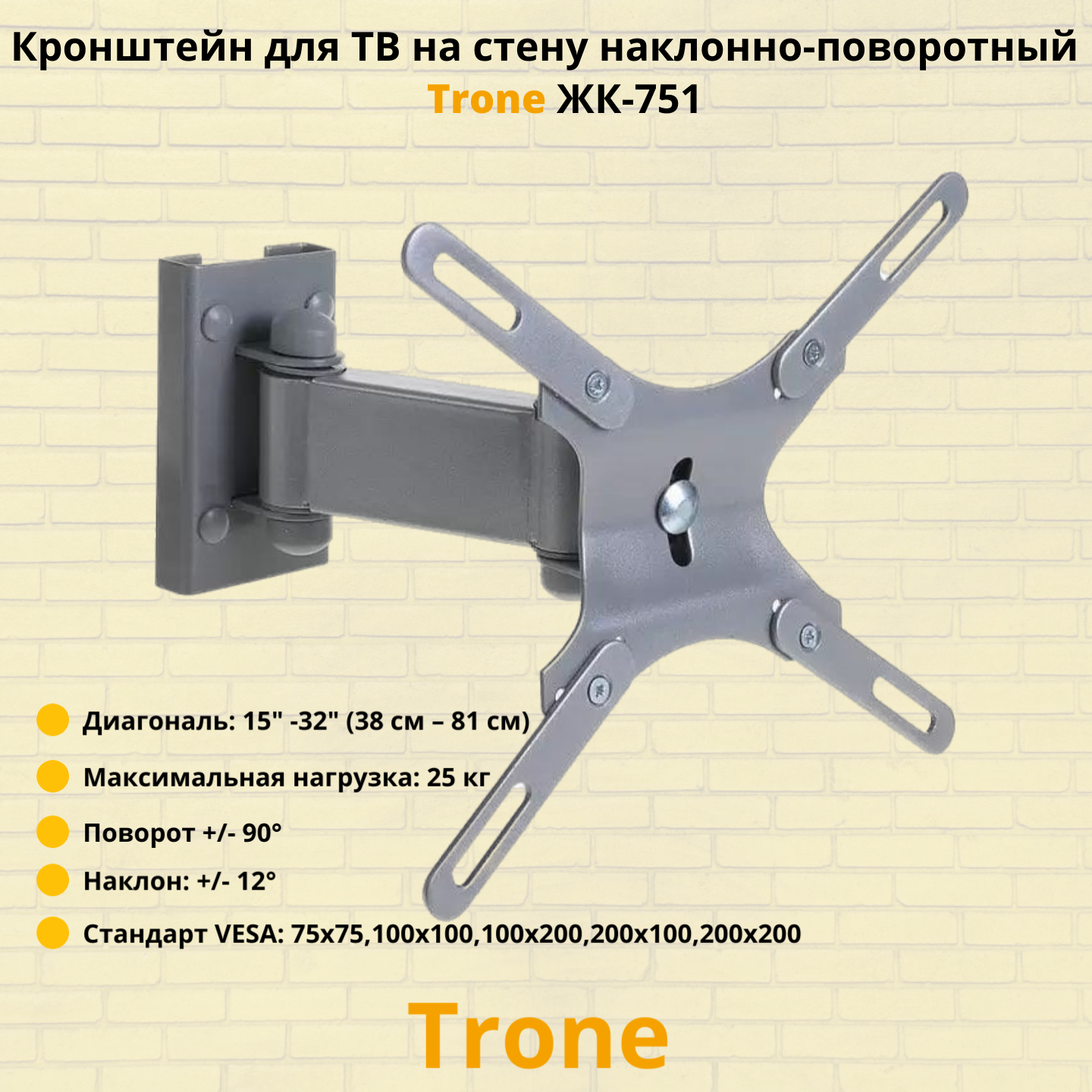 Кронштейн для телевизора на стену наклонно-поворотный с диагональю 15"-32" Trone ЖК-751,черный