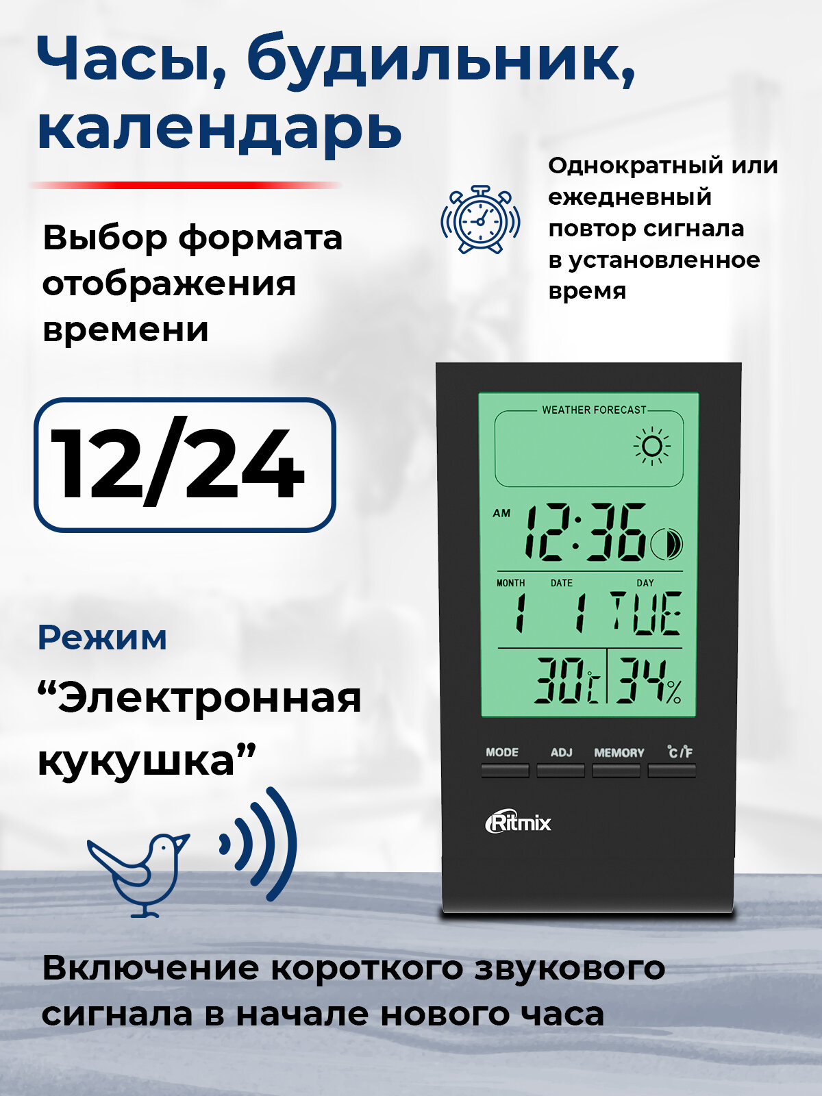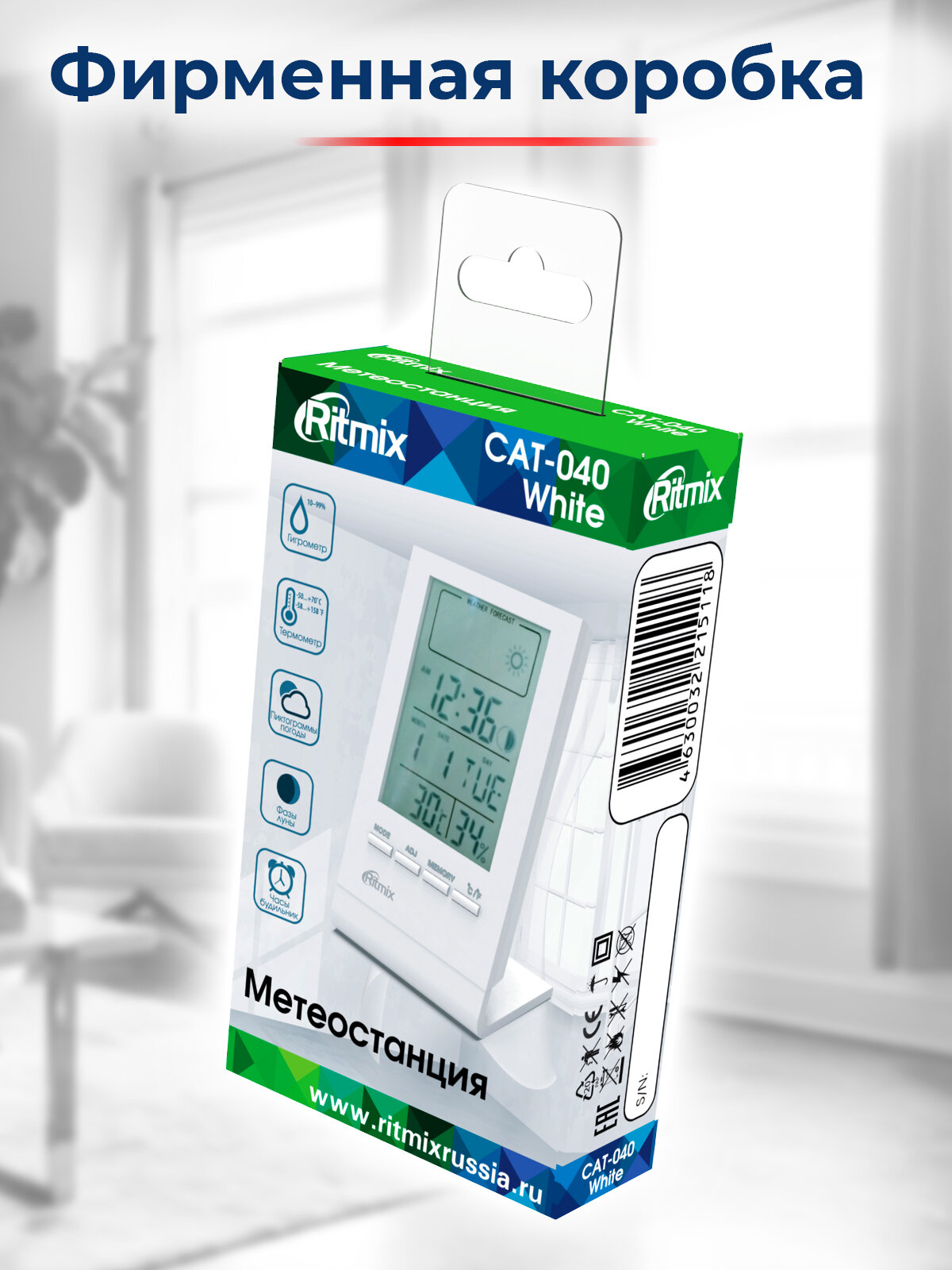 Метеостанция RITMIX CAT-040 белый, дисплей LCD, термометр комнатный, диапазон показателей температуры -50°C ..+70°C (-58°F..+158°F), гигрометр комнатный, диапазон показателей влажности 10% ..99%, электронные часы, будильник, календарь, питание от элемента
