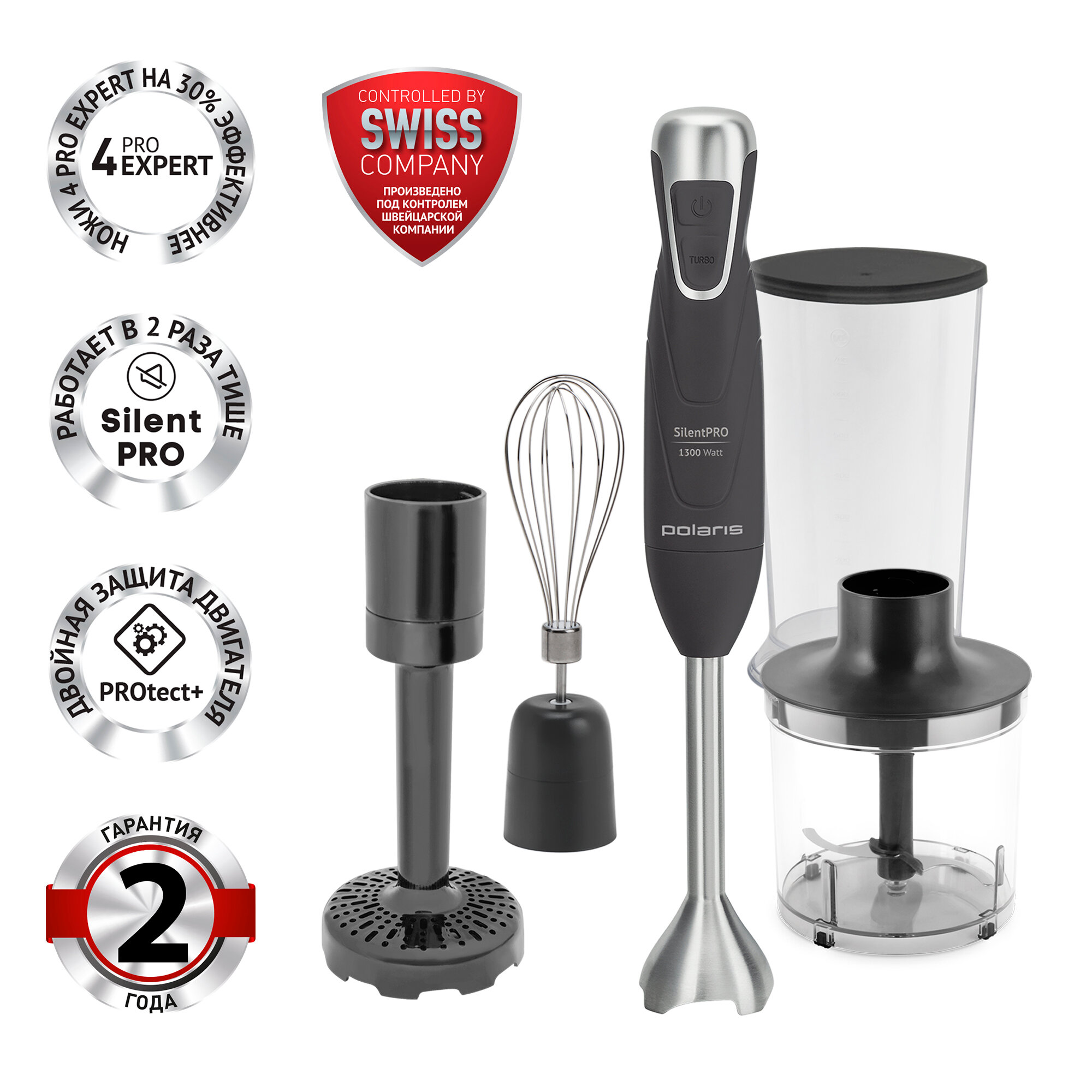 Блендер погружной POLARIS PHB 1380, 1300 Вт, 2 скорости, 4 насадки, стакан, серый, 47653, PHB 1380 Silent