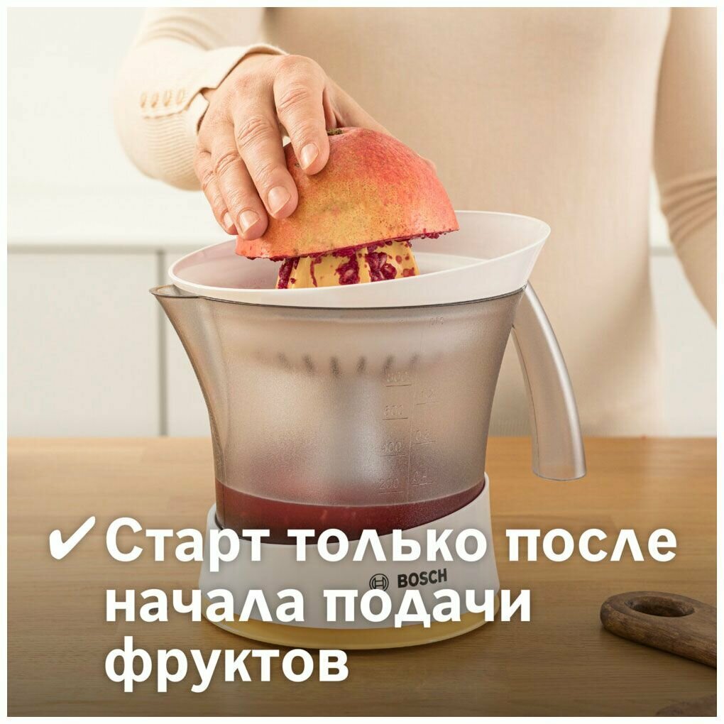 Соковыжималка для цитрусовых Bosch VitaPress MCP3500N, белый, автоматическое включение, отсутствие в пластике вредных ВРА-веществ, реверс, объем 0.8 л