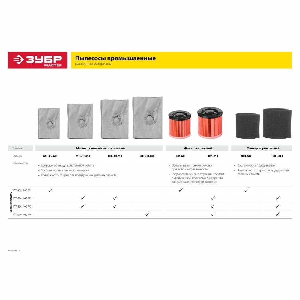 СохранитьМешок тканевый, ЗУБР МТ-15-М1, для пылесосов модификации М1, многоразовый, 15 л интересное: