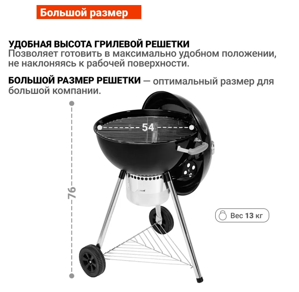 | Дополнительная информация | съемный золосборник; размер грилевой решетки: 54х54 см; высота грилевой решетки: 76 см |