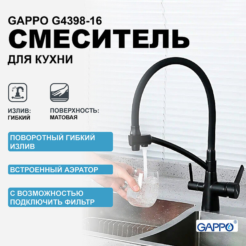 Смеситель для кухни 35к G4398-16 GAPPO гибкий излив, с вых. для питьевого фильтра, черный* интересное: